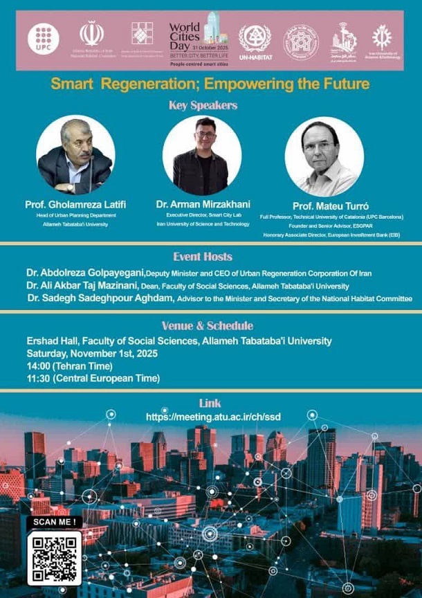 شرکت بازآفرینی شهری ایران با مشارکت برنامه اسکان بشر سازمان ملل متحد (UN-HABITAT) و آزمایشگاه شهر هوشمند دانشگاه علم و صنعت ایران، به میزبانی دانشگاه علامه طباطبایی، به مناسبت روز جهانی شهرها برگزار میکند: